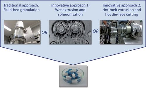For the purposes of this demonstration, the process evaluation included only two other process technologies: wet and hot-melt extrusion, both of which produce nearly spherical pellets for direct filling into capsules using a spheronizer and a dryer in case of wet extrusion, and a hot die-face cutting system in case of hot-melt extrusion, as depicted in Figure 3.