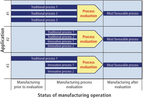 The manufacturing process evaluation methodology can be applied in three areas, as depicted in Figure 1 and discussed as follows.
