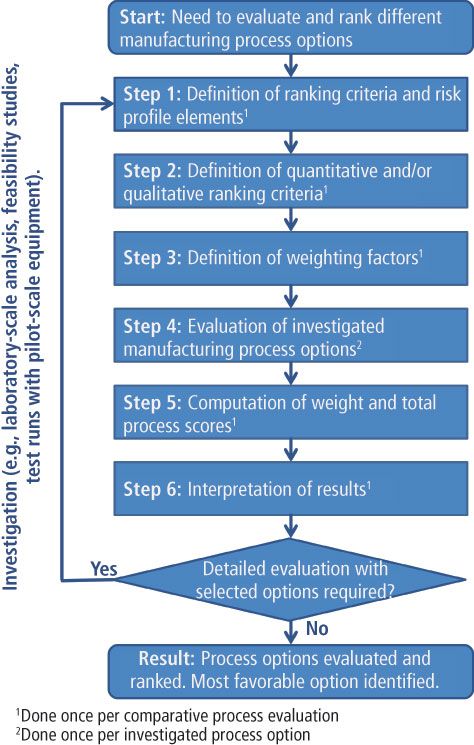 Process evaluation team. Because the results of a comparative manufacturing process evaluation depend on the experience and judgment of the individuals involved, it should be performed by a team that has enough technical, regulatory, and economic expertise to establish a holistic view of the investigated process options. Testing our methodology in an industrial setting confirmed that the best results were delivered when an individual from an external--and preferably independent--organization guided the company team through the evaluation process, taking all relevant dimensions of the problem into account and minimizing the effect of the company employees’ bias.
