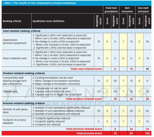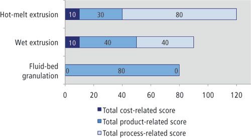 Cost-related process evaluation. Two cost-related ranking criteria were considered: investment into process equipment and direct material costs. Both cost-related ranking criteria received weighting factors of 15, meaning that each one constituted 15% of the total process score. The existing fluid-bed granulation process received a score of zero because it represented the current cost structure. Considering the investigated equipment prices, wet and hot-melt extrusions were assumed to be more cost-efficient with regard to the equipment investment. Hot-melt extrusion was particularly favorable and received a score of 2, because drying occurs in the processing section of the extruder using a vacuum system, as opposed to wet extrusion, which received a score of 1 because it requires a downstream drying system. As for direct material costs, hot-melt extrusion was slightly less advantageous because the quantity of a certain excipient had to be increased and/or a new excipient added. The total cost-related score, which was derived by summing up the individual scores and multiplying the result by the respective weighting factors, was the same for both extrusion technologies.