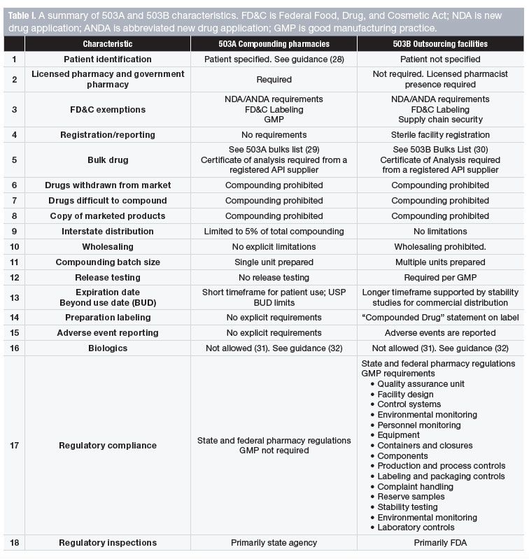 Table I. A summary of 503A and 503B characteristics. FD&C is Federal Food, Drug, and Cosmetic Act; NDA is new drug application; ANDA is abbreviated new drug application; GMP is good manufacturing practice.