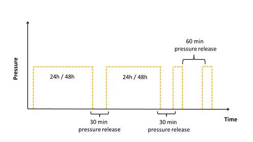 DoE. A full factorial DoE (23) was performed including a total of 10 experiments that varied the length of the run, the operating pressure, and either a monoclonal antibody (mAb) or buffer feed. Depending on the total length of each run, pressure was applied for 24 or 48 hours twice with a 30-minute pressure release after each filtration period as shown in Figure 1. For the 48-hour runs, an additional pressure release of 60-minutes was conducted. Fractions were collected in the beginning of each filtration and before and after each filtration period and pressure release to evaluate any impacts of the pressure profile.