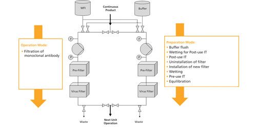 One possible process implementation for virus filtration in continuous processing is to use a set-up with two filtration lines that can be operated independently of each other in a preparation mode or operation mode (2, 6), as shown in Figure 4. Each line has a pump, flow and pressure sensor, adsorptive pre-filter, virus filter, and buffer and water-for-injection supply. Steps such as flushing, equilibration, filtration, buffer flush, wetting for integrity tests (IT), and IT are performed in preparation mode, whereas the product filtration is performed in operation mode. Ideally all valves would be fully automated, and implementation would be achieved in a sterile manner to avoid the need for steam-in-place and clean-in-place operations.