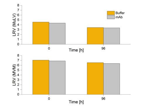 MVM and MuLV infectivity decreased during the 96-h operation time. The decline in MVM infectivity of 0.5 LRV is within the variation of the assay. MuLV, a large enveloped virus known to be a less stable virus, showed a higher decrease of titer with 1 LRV.