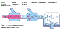 The patented continuous process begins with an emulsification step, followed by extraction and collection in a sequential manner.The resulting microparticles are then dried and prepared for the filling operation (see Figure 1). Process run time depends on the batch size and water exposure time. "From the time emulsification begins or at the initiation of microdroplet preparation that contain API, polymer, and solvent until we're in the drying portion of the process, we keep water exposure to the product to under 24 hours," explains Bruce Hudson, senior engineer at Brookwood.
