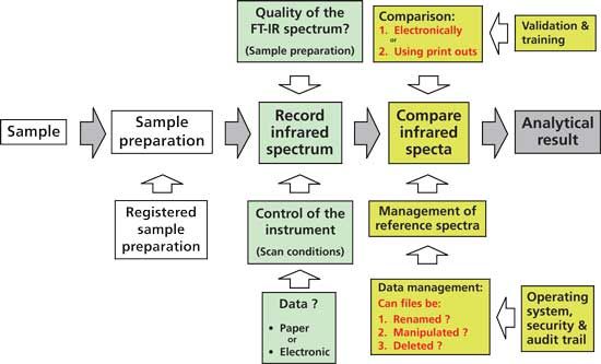 Nevertheless, when these steps are examined in detail, it soon becomes apparent that many of the steps have data integrity and/or scientific compliance risks associated with them. Figure 2 shows an expanded representation of the flow chart shown in Figure 1. Fundamentally, the way the sample is prepared for examination by infrared has a significant influence on the quality of the spectrum obtained.