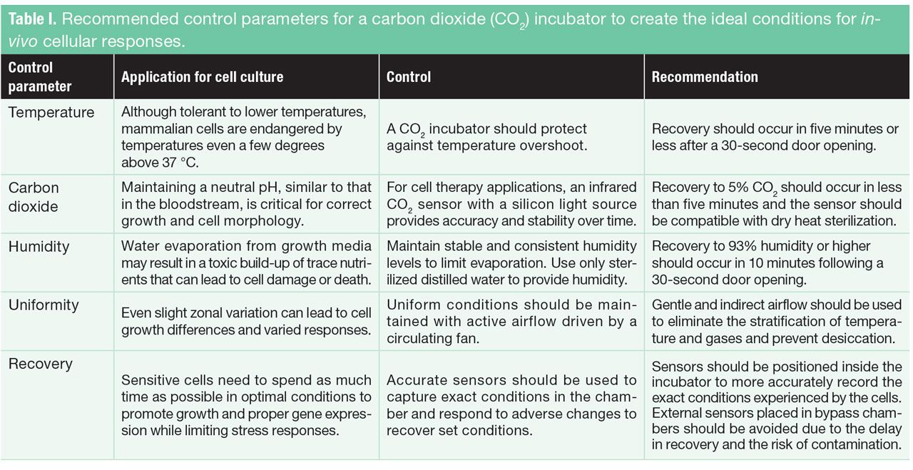 In the production of cells for human therapy, CO2 incubators must provide a highly controlled environment to support optimal cell growth, ensuring proper gene expression, limiting stress responses, and preserving characteristics critical to the success of the therapy. Equipment design and engineering play a critical role in how cells grow; different incubator models show widely different performance (3), even if functional specifications are similar. Ideally, CO2 incubators used in cell production should offer recovery of all conditions (i.e., temperature, CO2 gas concentration, and humidity) in 10 minutes or less following a 30-second door opening. Fast recovery ensures sensitive stem and primary cells remain in their ideal growth environment (see Table I) for the maximum time during production, helping to ensure high-quality cell therapy products.