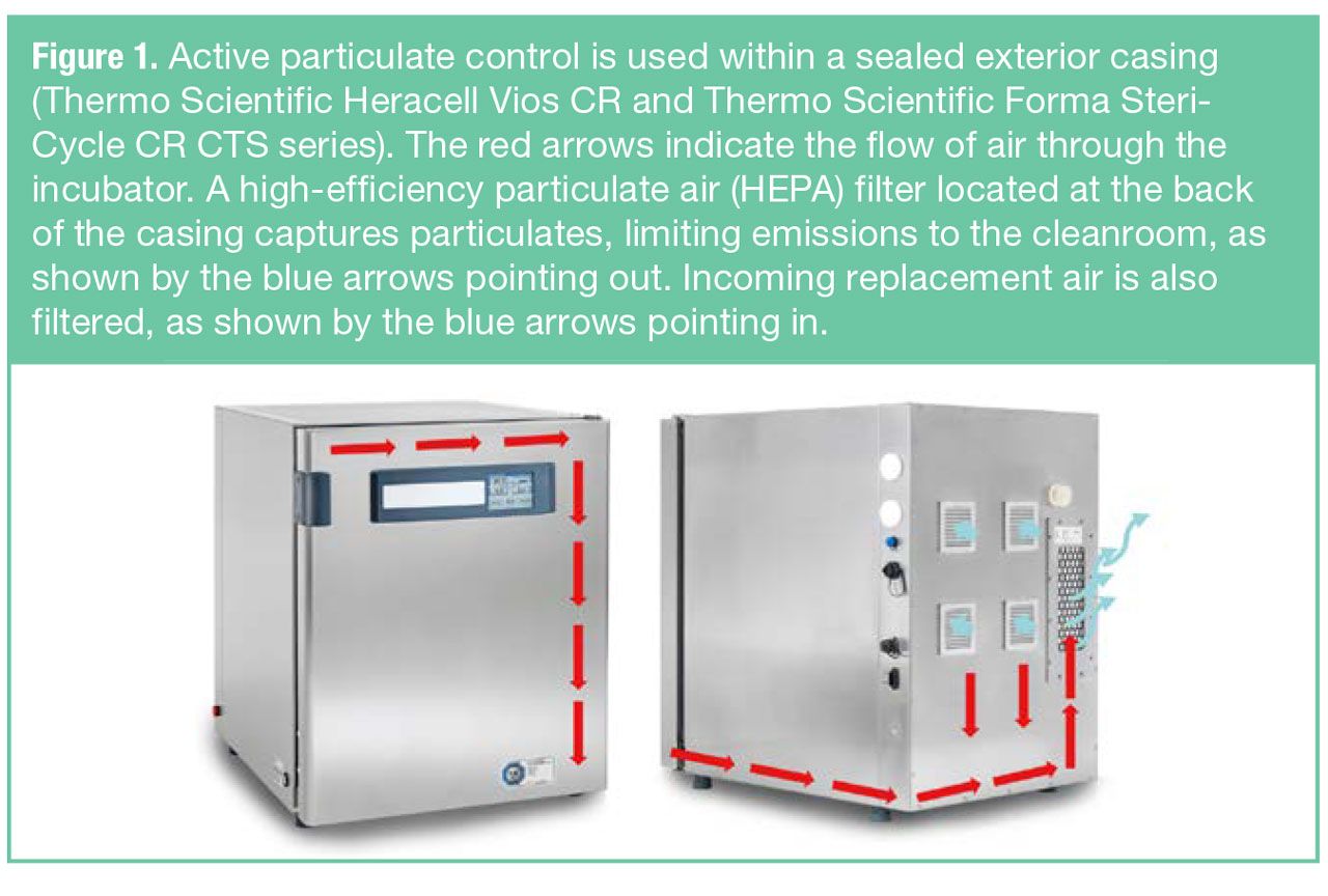 In a design used in cleanroom-certified incubators from Thermo Fisher Scientific, for example, a HEPA filtration system limits particulate release to the cleanroom. The entire external casing is sealed, and a vacuum system captures particulates, passing them to the HEPA filter at the rear (see Figure 1). Incoming air to cool the electronics is also filtered.