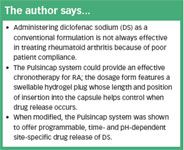 Diclofenac sodium (DS) is a potent NSAID frequently used to treat RA; however, oral administration of DS as a conventional formulation generally fails to achieve the desired clinical effect because it elicits patient incompliance — many fail to take the dosage early enough in the morning to coordinate with the rhythm of RA. Therefore, the development of oral controlledrelease formulations of this drug is highly desirable.