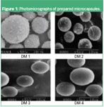 The average particle size and morphology of the drugloaded microcapsules10 (n=100) of batches DM1 to DM4 were assessed by using a digital optical microscope (Labomed CX RIII, Ambala, India) and SEM microscopy, respectively. The microcapsules' morphology was characterized by their sphericity and clumping. The results are reported in Table 1 and Figure 1.