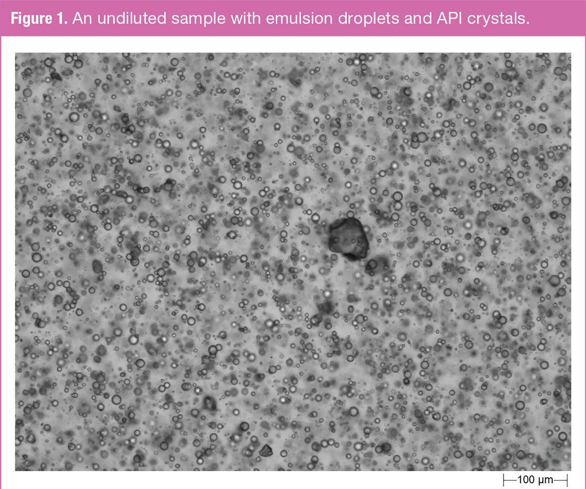 The use of these advanced classifications can be demonstrated with a typical undiluted topical cream sample containing emulsion droplets and crystalline API. Figure 1 shows a general microscopic image of a topical cream containing emulsion droplets and crystalline API particles in low concentration. The matrix is thick, and the emulsion droplets appear to be touching. Sporadically, API crystals can be observed.