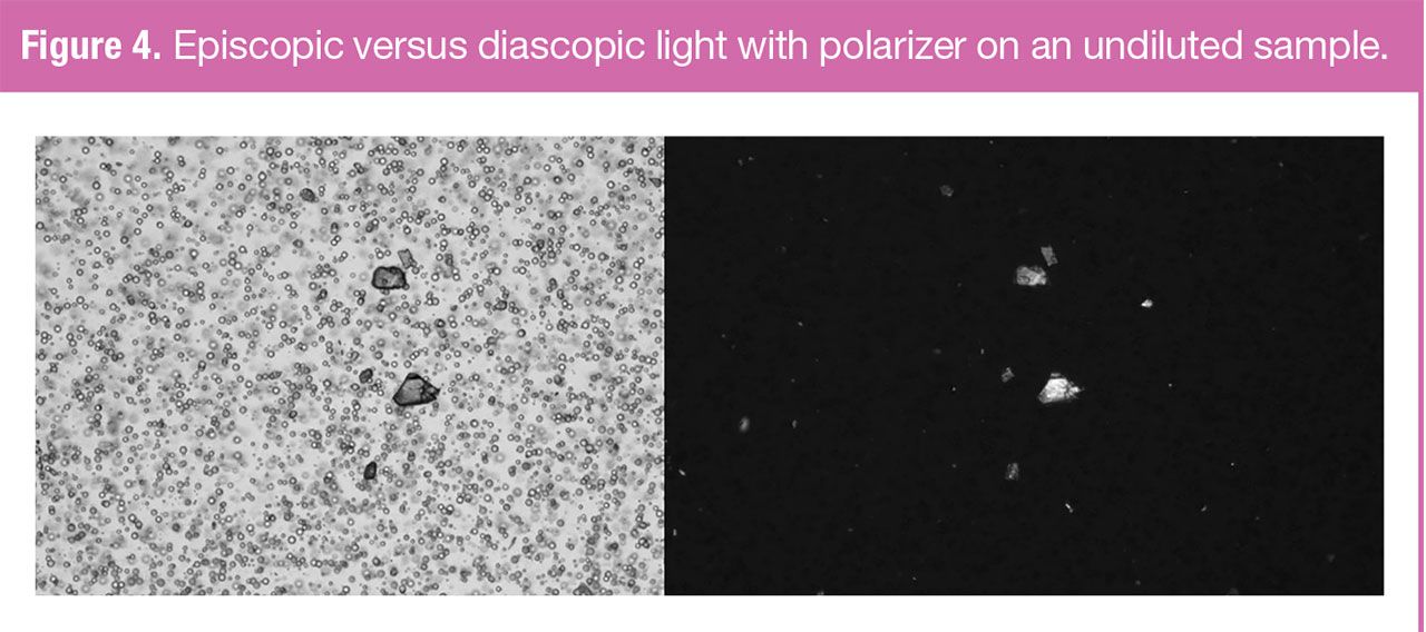 For simple definition purposes within the scope of this article, a polarizer is an optical filter which allows light waves of a specific polarization to pass through while blocking light waves of other polarization planes. The polarizers work by using the birefringent properties—defined as the optical property of a material having a refractive index that depends on the polarization and propagation direction of light (5)—of crystalline material to further illuminate material while ignoring non-crystalline material. An example of the undiluted sample under episcopic light (top light) in comparison to the same field of view under diascopic light (bottom light) with a polarizer can be seen in Figure 4.