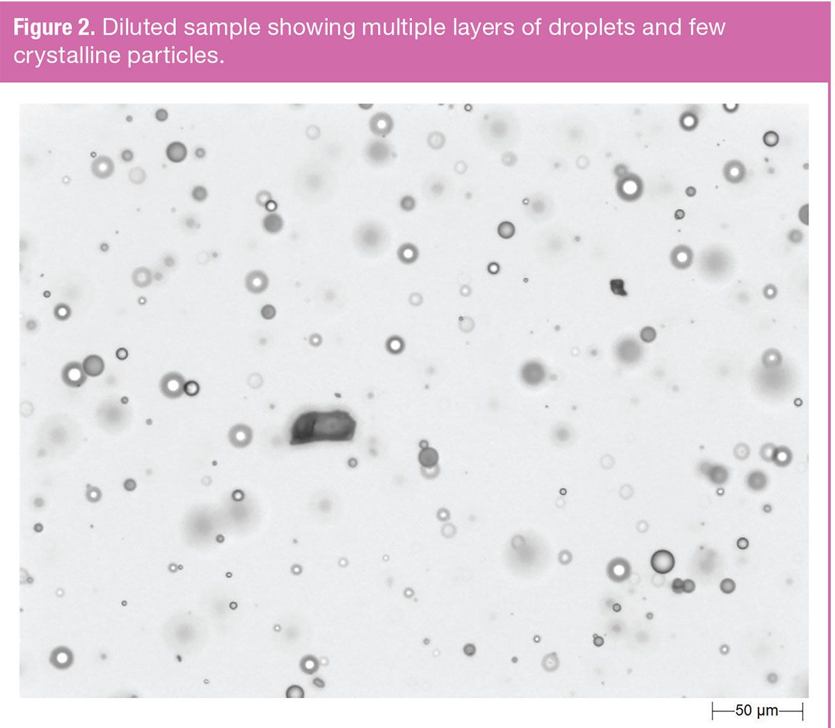 Another thing to be aware of is that image analysis, like most techniques, will incorrectly assume two particles touching to be one particle; therefore, in this sample, dilution should be performed in order to obtain an accurate particle size distribution for the droplets. However, upon dilution, the occurrence of the API is significantly further reduced, potentially biasing the crystalline material population if the user was to proceed with the analysis (Figure 2). Care should be taken to ensure dilution will not adversely affect the particles or droplets.