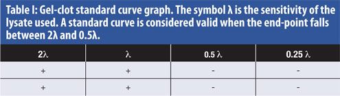 Table I: Gel-clot standard curve graph. Table I: Gel-clot standard curve graph. The symbol λ is the sensitivity of the lysate used. A standard curve is considered valid when the end-point falls between 2λ and 0.5λ. (Figure courtesy of the author.)