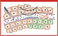 Figure 3: Plasmid DNA uptake and release after capillary break and extravasation into the tissue. The secondary carriers (e.g., polyplexes) are attached to the microbubble wall (bottom left corner). After ultrasound-mediated microbubble destruction the polyplexes leave the vessel and penetrate the tissue. They are taken up by cells and escape enzymatic digestion. The therapeutic plasmid is then released to the nucleus and expressed. Adapted from Ref. 33. (IMAGE IS COURTESY OF THE AUTHOR)