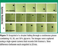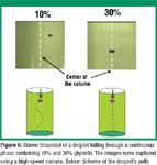 Images of the droplets falling through the stagnant liquid were captured using a high-speed CCD camera that records images at the rate of 500 frames/s. The camera was set to span the entire 3-in. width of the column, and the images were captured after the droplets had fallen approximately 25 cm. Figure 6 shows snapshots of droplets falling through 10% and 30% glycerin solution. From the detailed analysis of all the snapshots (34), one can see that the droplets change shape continuously as they fall. The droplets change from a horizontally elongated cap shape to an elliptical shape and then back to a cap shape. When a droplet fell through the 10% glycerin solution, it was observed to have both path and shape oscillations. The droplets were always released in the center of the column. In the case of the 10% solution, the droplet clearly has moved off center, moving from one side of the column to the other in a zig-zag fashion as it falls, as illustrated in the schematic drawing. Although not visible in the snapshots, this clearly indicates the existence of vortex shedding, as shown by many groups (24).