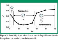 in which A is the liquid-phase reactant, G is the dissolving gas, P is the product, and BP the byproduct (19). This could be a generic network corresponding to a hydrogenation and overhydrogenation. A typical result of our study is shown in Figure 3, which plots the selectivity YP toward the reaction as a function of the bubble Reynolds number. The initial decrease of YP coincides with the onset of recirculation. Recirculation leads to a significantly increased residence time of the product P in the wake and reduces the concentration of the reactant A in the wake. Effectively, the recirculating pattern in the wake acts as a barrier for reactant A, which cannot enter the wake. Thus, because the concentration of A is low, a larger fraction of the gas G reacts with P to form the secondary product BP, leading to a decrease of the selectivity. At Reynolds numbers greater than 52, vortex shedding occurs, which causes a sudden increase of selectivity (see Figure 3). Once vortex shedding occurs, patches of the dissolved gas G (and product P) are quickly convected away from the bubble into regions rich in A, thus leading to significantly higher selectivities toward P. In effect, the transition from a closed wake to an open wake qualitatively changes the mixing behavior, which can lead to a large change in the reaction selectivity.