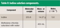 The organic iodine solution was prepared using the recipe listed in Table II. The resulting concentration of iodine in methylene chloride was 31.7 ± 0.1 mg iodine/mL methylene chloride. The solution was aged for several hours to ensure all of the iodine had dissolved.