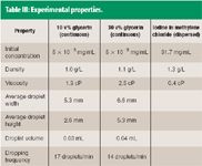 The viscosity of the solution was controlled by adding glycerin, which lowers the droplet Reynolds number and changes the wake dynamics of a droplet. The glycerin, however, does not affect the reaction nor the HPLC analysis. The glycerin concentration was fixed at either 10% or 30% (and 50%) for the set of experiments. Table III contains information about the experimental properties of the two phases as well as the droplets' parameters.