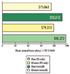 Salary according to gender only. On average, women working full time earn 82% of the average salary reported by men working full time (see Figure 3). The gap between men's and women's salaries is slightly less than it was last year, but still close to the 80% reported in the third quarter 2005 report by the US Department of Labor (1).
