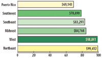 Salary according to location. On average, employees in Northeastern and Western states earned the highest salaries (see Figure 5). Salaries in these regions were nearly 45% higher than those in Puerto Rico, which reported in the lowest values.