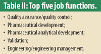 Job description. About one in five respondents work in quality assurance and quality control (22%), followed by pharmaceutical development (11%), pharmaceutical analytical development (9%), validation (8%), and engineering or engineering management (6%) (see Table II).