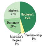 Education and professional work experience. Fifty-two percent of employees had a degree beyond a bachelor's degree (see Figure 2). The most common fields of study were analytical chemistry and biology (or biology-related) (14.5% each). A significant number of respondents (12%) also said they earned their degree in pharmaceutics or pharmacy. Surprisingly, 9% said they had studied in a field unrelated to pharmaceutical science or industry.