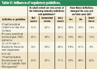 Impact of regulations and legislations. For the first time, our questionnaire asked employees to indicate their awareness of various regulatory initiatives and gauge the effect of these initiatives on the manner in which they perform their jobs. The Food and Drug Administration's rule on electronic records and signatures (21 CFR Part 11) has made the biggest impact so far. Only 6% said they are not aware of the rule (see Table VI).