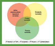 Achieving consistency. Two main approaches can be used to achieve consistent products. The traditional approach is to specify the input parameters more tightly, particularly the excipients and process (but also the API), and to limit the product variability by limiting the input variability. This approach does not address the variability in interactions. This interaction factor, the sum of all the interactions, also can cause problems (see equation in Figure 2).