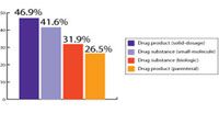 More than half of the respondents said that they or their companies were working on projects that incorporated QbD initiatives and nearly one quarter are not (see Figure 3). Respondents who say they or their companies are working on QbD-related projects are most frequently doing so for the manufacturing of solid-dosage products (47%) and small-molecule drug substances (42%) (see Figure 4). A lower number of respondents are working on QbD projects in biologic drug substances (32%) and parenteral drug products (27%) (see Figure 4).