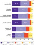 Innovation for robotics, automation, and wireless technology was not given high priority during the next five years (see Figure 7). Only 20% said that innovation in robotics and automation was very important, and 15% said it was not important. Fourteen percent said innovation in wireless technology for pharmaceutical manufacturing was important, and nearly 19% said it was not.
