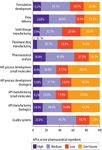 The survey asked respondents to rate the level of innovation during the past year (see Figure 1). Respondents most frequently rated innovation high in drug delivery (24%), quality systems (21%), and pharmaceutical analysis (19%). Process development and manufacturing of biologic-based active pharmaceutical ingredients (APIs) and formulation development ranked in the middle. Fourteen percent of respondents rated innovation high in process development and manufacturing of biologic-based APIs, and 12% rated innovation high in formulation development.