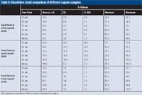 The observation of reluctant capsule shell rupture was a good indication that dissolution failure was most likely caused by cross-linked capsule shell rather than drug performance. To further confirm this theory, an investigation in which capsules were switched and subjected to dissolution testing using Tier I was performed. Dissolution data for switched capsules are provided in Table II; data for fresh drug blend in fresh capsule shells are included for comparison. As expected, the capsules with fresh drug blend in aged capsule shells had individual low results and significantly high variation at every time point. The capsules with either old or fresh blend in fresh capsules shells both had satisfactory results. The study results proved that the aged capsule shells, rather than product-quality change, caused the original dissolution failure.