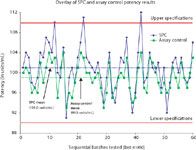 We may want to start with the easiest variance component, the assay variance, as monitored with the assay control. Figure 1 illustrates the relationship between the assay performance and observed recent SPC potency results (last n=60).