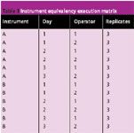 An example for an execution matrix for instrument equivalency is illustrated in Table 1. The testing of various production lots, unlike the obligation to include this for AMTs (current regulatory expectation), should not be involved as this may not help for the purpose of the equivalency studies.7