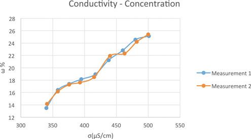 The authors defined a linear equation to describe the relation between the concentration and the conductivity: y(concentration%) = mx(conductivity)+q.