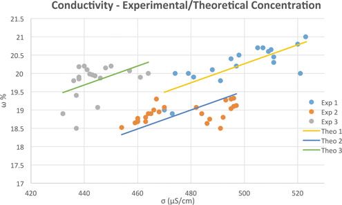 To optimize the intercept value for each test (data obtained experimentally are named EXP1-2-3), the standard deviation, Σ (ωsp - ωteo) ^ 2, has been minimized through a generalized reduced gradient method to have the minimum difference between experimental and theoretical concentrations. As shown in Figure 4, three lines with the same angular coefficient but different intercept (Theo 1, 2, 3) have been obtained.