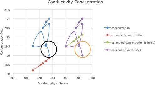 As can be noted from Figure 5, the data obtained (blue) were higher than those estimated theoretically from the equation (red). The observed trend is parallel to the theoretical one, except for the outliers (black and orange circle) that were observed immediately after manually diluting the solution. Stirring plays an important role in keeping the solution uniform. If left static, the values can differ due to the formation of layers of different concentration.