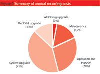During the analysis phase, a list of unique terms or whose assignments that have changed is created. Terms, whose text but not assignment or scope has changed are then automatically recoded, as are all so-called "direct hits" (verbatim equivalent to a lowest term level [the lowest hierarchy level in MedDRA]). The remaining unique terms must be manually recoded and the new codes re-entered into the system. A statistically relevant sample is then manually checked for verification and validation. The last step is an impact analysis on all reported cases for "open" PRs and PSURs. The upgrade of the WHODrug dictionary is usually much easier because it only impacts on the company's drugs; concomitant medications do not usually require substantial manual recoding and have little impact on the PSURs (Table IX). To simplify the total of annual recurring costs, it is approximated that one system upgrade and one upgrade of both dictionaries is performed per year (Table XII and Figure 4).