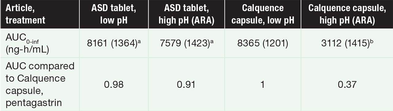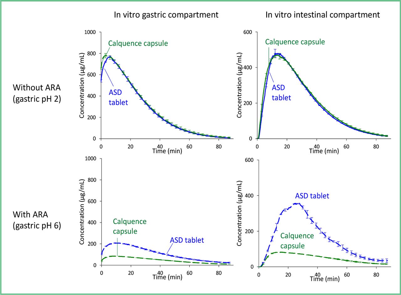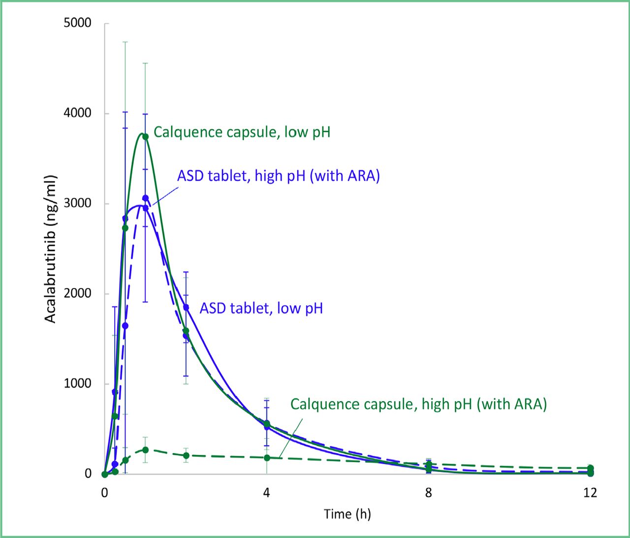 ASD tablets were shown to overcome the ARA (i.e., pH) effect observed with the oral oncology medication, Calquence, at a 60% smaller dosage unit size in fasted beagle dogs. Whereas ASD tablets achieved similar average AUC in dogs under low and high gastric pH conditions, Calquence capsules achieved a 63% lower,