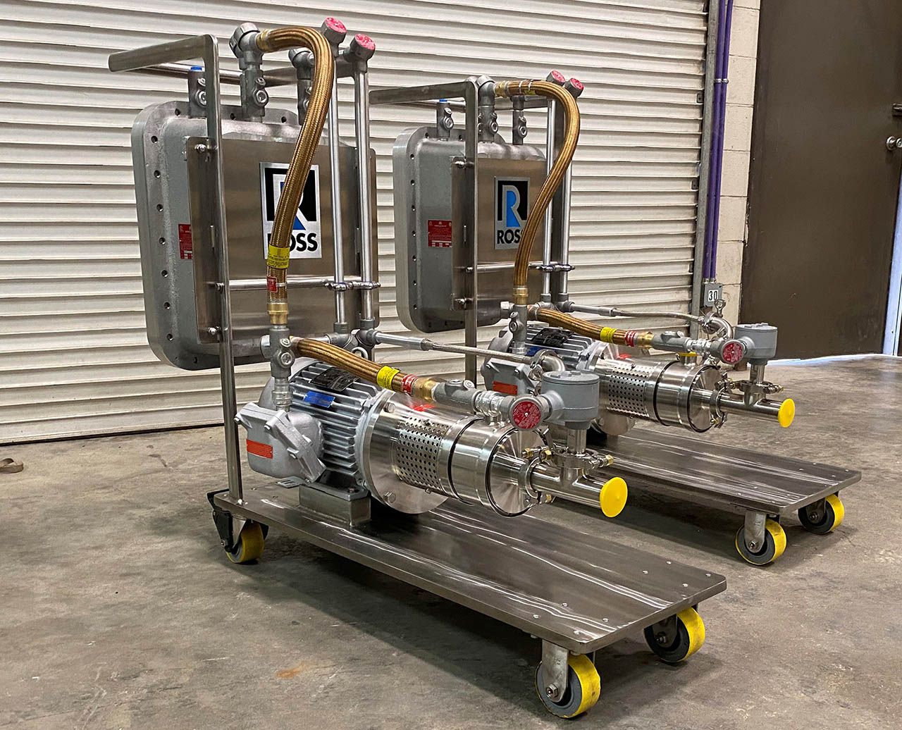 Inline High Shear Mixers from ROSS are suitable for a wide range of dispersion, emulsification, and homogenization requirements, while remaining completely portable and explosion-proof. The models can be equipped with a NEMA 7/9 operator station pre-wired and mounted to the mobile mixer cart. The controls can be customized to include a viewing window for process variables and intrinsically safe thermocouple, which is attached to the motor’s internal thermal switch. Kalrez elastomers allow the mixer to be used in extreme-duty processes with chemically aggressive fluids. Stainless steel construction, sanitary tri-clamp connections, 3A stamps, double mechanical seal, and washdown motors are also available.