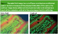 In Figure 2, we can see the difference between wide field and confocal images. The image that is collected by a system with standard optics (wide field) has restricted control over the depth of field and consequently the haze. A system that has additional flexibility to restrict the depth of illumination and observation (confocal) will remove the haze, and dramatically improve the image quality for resolution and contrast.