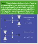 Image restoration by deconvolution is shown in Figure 4. As explained previously, all wide field microscope images are a result of the unperturbed image, 'convolved' with the image blur produced as a result of using a finite NA. This can be modelled by saying the image is convolved with the PSF (Figure 4a). Conversely, a convolved image (the one that you record) can be 'deconvolved' with the known or measured PSF to produce the unperturbed image or crisp image (Figure 4b).