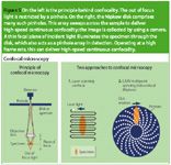 One thing that can be done to improve a wide field system, is to limit axial (Z) observation depth: thinly illuminating and observing any section will achieve the desired result. This can be realized by using pinholes in the illumination and observation paths (Figure 3). The effect is to increase the NA and reduce the haze as there is a reduction in the Z depth of the viewed image planes. This is, therefore, a 'light rejection' approach as the out of focus blur is eliminated by light rejection.