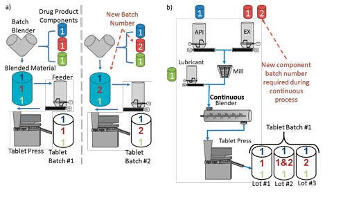 From these definitions, the argument can be made that a continuous production run, in which the critical process parameters (CPPs) remain within a validated range resulting in acceptable tablet critical quality attributes (CQAs), constitutes a single batch. And as batches of tablet components change during this continuous production run, the lot number can distinguish between tablets whose components come from different batches. In the case that one component of the formulation changes the batch number, theoretically, the tablet quality should not change, given that the process conditions are unchanged. For material traceability purposes, however, the tablets containing raw material from one batch and another need to be distinguished. Because this raw material batch change occurs during a single manufacturing order, with no changes to the process conditions, it is, therefore, still the same batch of finished drug product. However, the tablets containing the new raw material batch can be assigned to a separate “lot” within the current tablet batch, making the lot a “specific identified portion of a batch” in which the tablets contain material from a raw material batch different from the previous lot. The idea is that, when tablets are released, a specific batch number and lot number trace exactly what raw material batches are present in the tablet. Figure 1 graphically illustrates the difference in material traceability between (a) batch and (b) continuous processes.