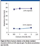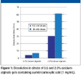 Figure 1: Dissolution in citrate of 0.5 and 2.0% calcium-alginate gels containing aurintricarboxylic acid (1 mg/mL). (FIGURES ARE COURTESY OF T.J. SMITH)