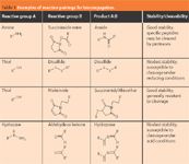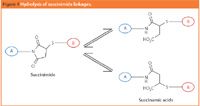 In vitro stability. The in vitro stability of the A–B link has to be considered in tandem with the in vivo properties just discussed. Some linkages such as disulfides and hydrazones have a poorer reputation for stability than others, such as amides or thioethers. However, it should be noted that even in the latter category complications can occur. While thioethers are not prone to cleavage of the A–B bond, ring-opening of the maleimide-derived examples commonly encountered can sometimes yield a heterogeneous mixture where the linkage contains both succinimide and succinamic acid linkages (Figure 4).14