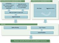 High-performance particle-engineering technologies will not be actualized if they cannot be scaled into robust, repeatable, and cost-effective industrial processes. NanoCluster technology can be scaled up for industrial-quantity production. Unlike other particle technologies that require complex, expensive processing equipment to conduct a multistep manufacturing process, NanoCluster powders typically are produced through simplified manufacturing steps (see Figure 3). Active pharmaceutical ingredient powders are reduced to nanosized particles by well-established and accepted processes such as precipitation or mechanical methods such as media milling. In the postprocessing agglomeration approach shown in Figure 3, the nanoparticles are discharged into a tank to form a quasi-stable colloid before agglomeration. Agglomeration can be accomplished through several methods, including the metered addition of a small amount of an excipient or the simple adjustment of processing parameters. NanoCluster formulations sometimes require little (<5%) or no excipient to achieve the desired product characteristics.
