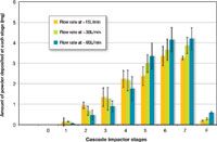 Figure 2: The influence of respiratory flow rate on the Aerodynamic particle-size distribution of the budesonide NanoCluster (Savara Pharmaceuticals, Austin, TX) inhalation powder. The authors used an Andersen cascade impactor at 25 °C and 45% relative humidity.