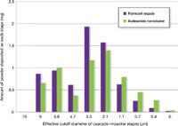 Figure 4: Comparison of Pulmicort Respule (AstraZeneca, London) and budesonide NanoCluster (Savara Pharmaceuticals, Austin, TX) performance by the LC Plus nebulizer (PARI, Midlothian, VA). The authors used an Andersen cascade impactor with a rate of 30 L/min at 25 °C and 45% relative humidity.